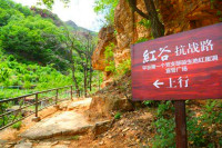 - 步行1000米到P1停车场,在此可以体验担架,背靠背景板合影留念,沿红色栏杆走小路上山,到达平谷第一个党支部诞生地——“红崖洞”,由讲解员讲述第一党支部的来历和英烈故事,重温入党(入团、入队)誓词