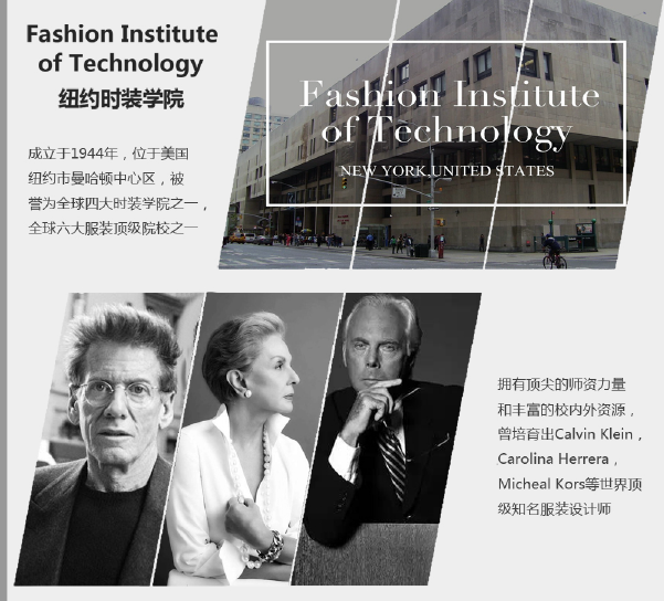 【服装设计学院简介】:纽约FIT时装学院(FIT)成立于1944年,位于美国纽约市曼哈顿中心区,被誉为全球四大时装学院之一,全球六大服装顶级院校之一;拥有资深的师资力量和丰富的校内外资源,曾培育出Calvin Klein,Carolina Herrera,Micheal Kors等世界知名服装设计师